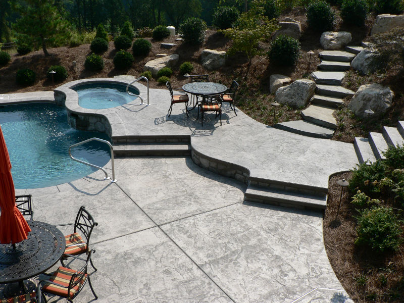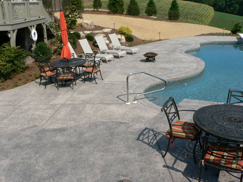 Concrete was chosen as the ultimate building material due to its durability and sustainability, as well as, the fact that it may be custom colored and shaped to meet any requirement.The design team used an integral grey color pigment in the concrete, a dark gray release agent and the Cesar Stone stamp pattern along with a free flowing shape to create the perfect pool. As you can see in the pictures of the pool deck, it all came together beautifully as the color and finish of the concrete was a perfect complement to the look of the local natural limestone boulders used on the project.