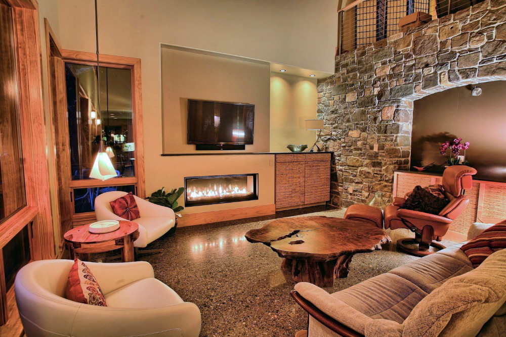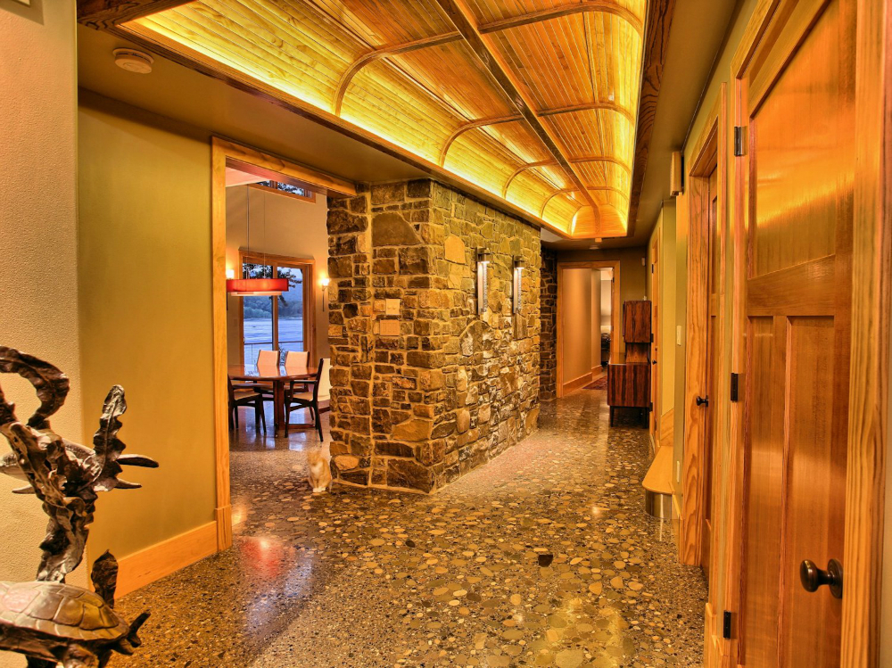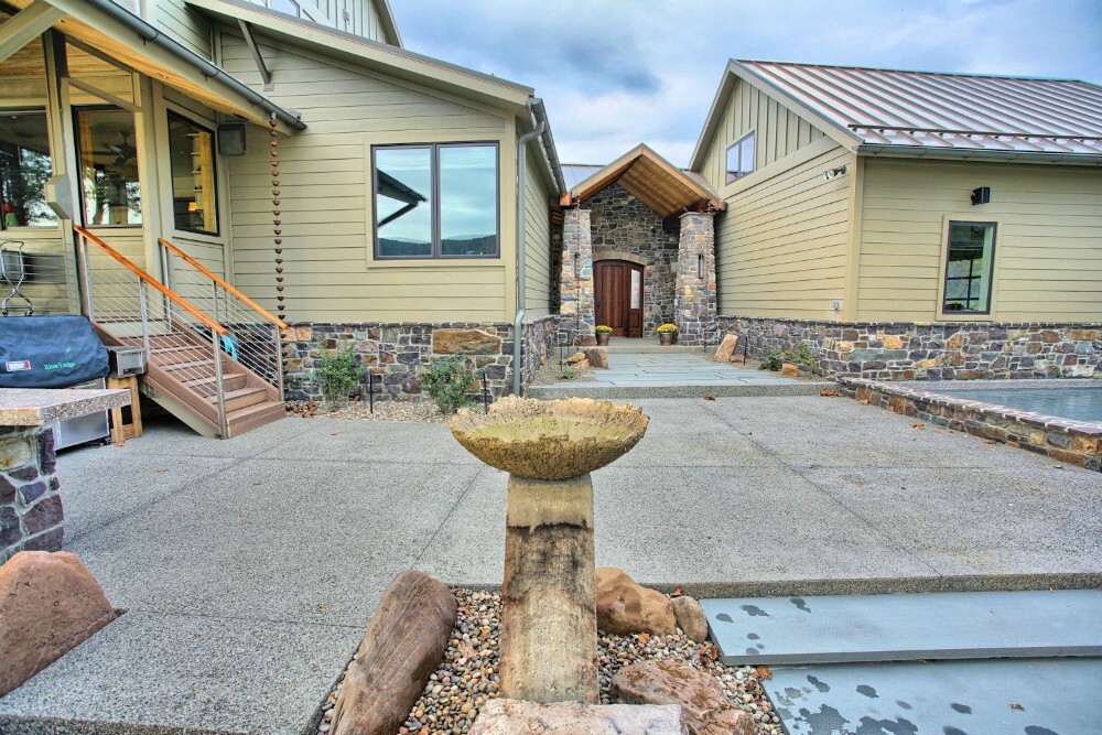 Featuring a color stamped concrete driveway, exposed aggregate concrete walks & patios and an interior polished concrete floor utilizing integral color and river stone aggregate the River Lodge is a showplace for the versatility and beauty that concrete offers as a construction material.